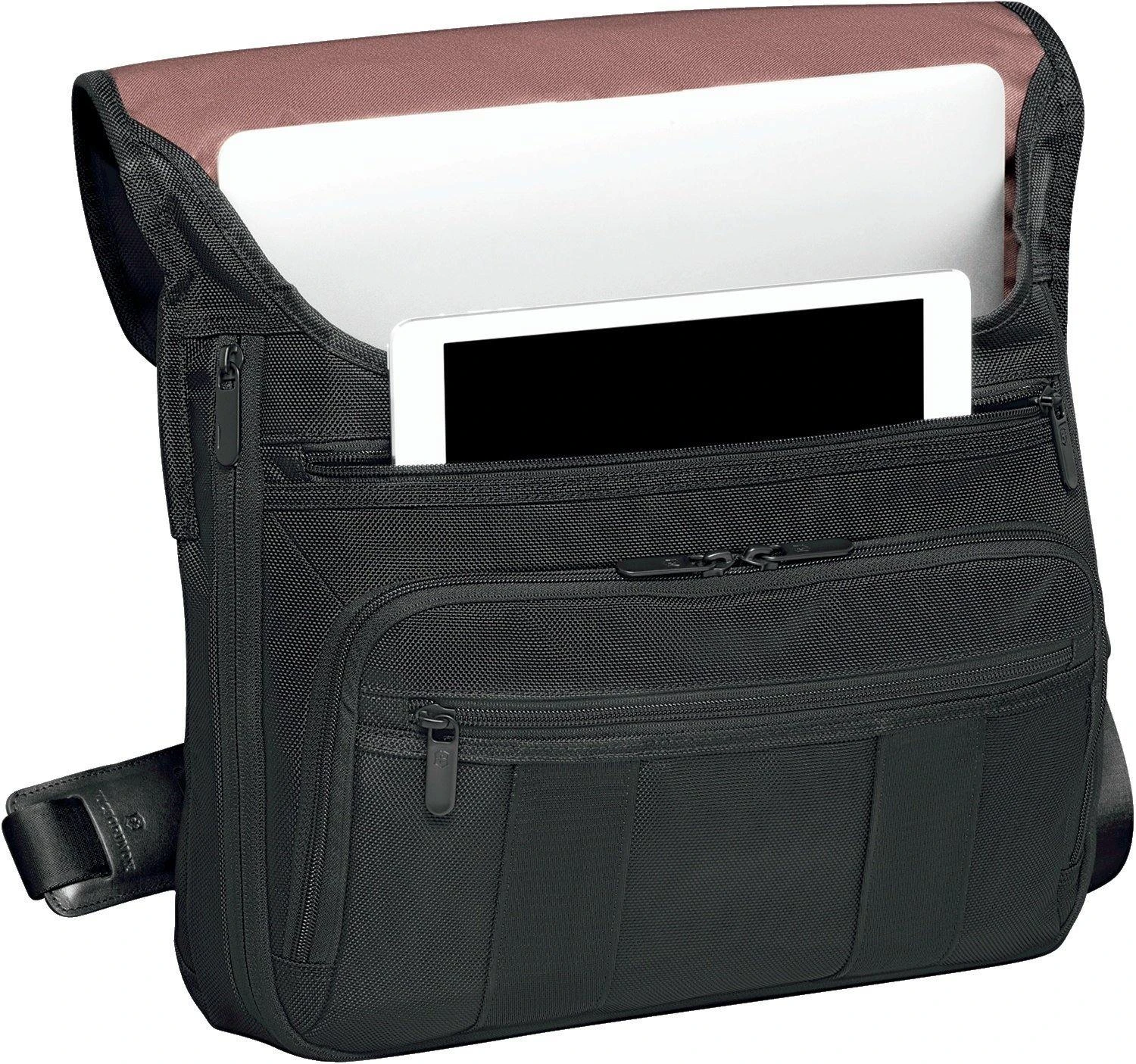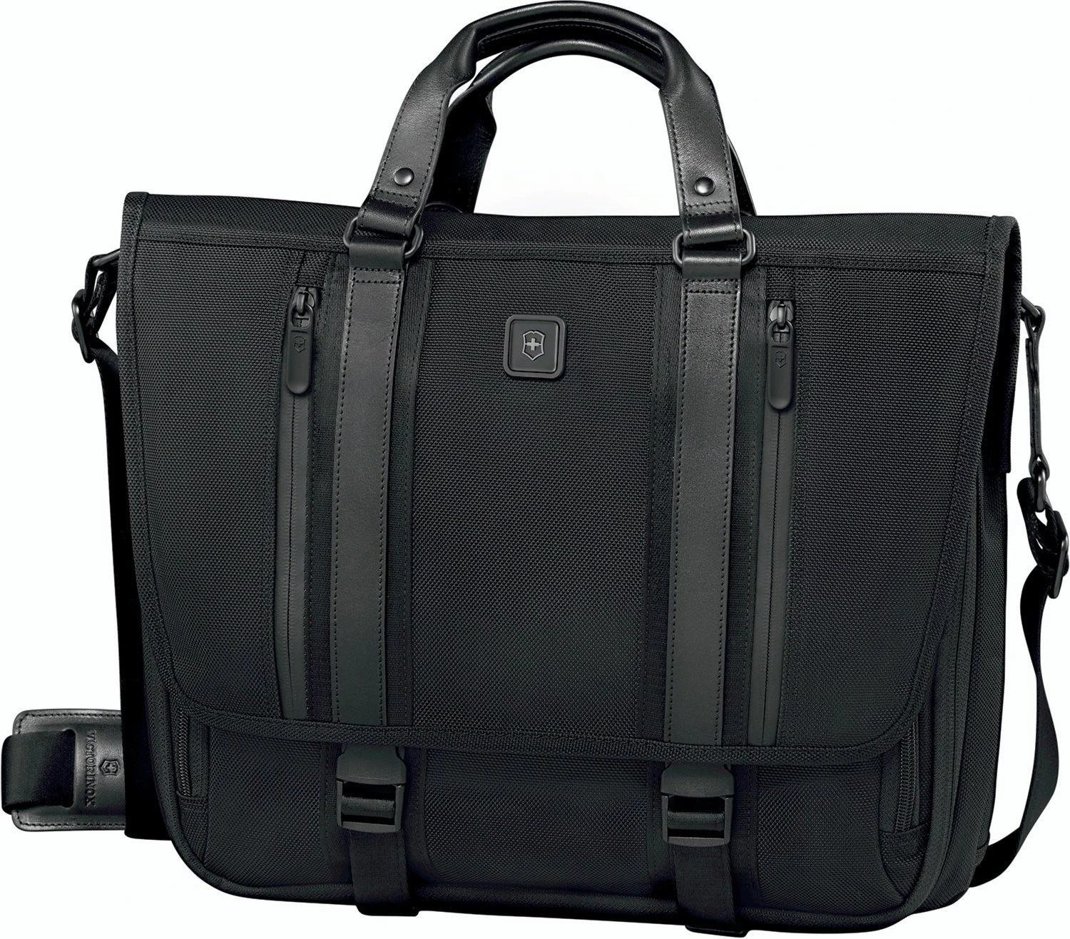 Color:Black Delivering function and versatility, this expandable laptopmessenger contains ample organization to accommodate any professional need.Padded compartment holds up to a 14 laptop. Padded tablet / eReader pocketwith premium twill lining. Features two zippered storage pockets. Frontorganizational panel contains two electronic device pockets, business cardpockets and pen loops. Exterior organization includes two quick-access frontpockets and a full-length rear zippered pocket that converts to a sleeve forsliding over the handle system of wheeled luggage. Expands 5 cm (2) foradditional capacity. Removable, adjustable padded shoulder strap. Custom YKKzipper pulls feature a thumb groove inspired by the Swiss Army Knife. Premiumtwill lining in select interior pockets. Leather haul handles. Swiss TrackerBag Tracking Program will reunite you with your bag anywhere in the worldshould it ever be lost “ for free.